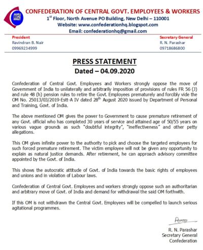 Confederation of Central Govt. Employees and Workers strongly oppose the move of Government of India to unilaterally and arbitrarily imposition of provisions of rules FR 56 (J) and rule 48 (h) pension rules to retire the Govt Employees prematurely and forcibly vide the OM No. 25013/03/2019-Estt-A IV dated 28. August 2020 issued by Department of Personal and Training, Govt. of India.