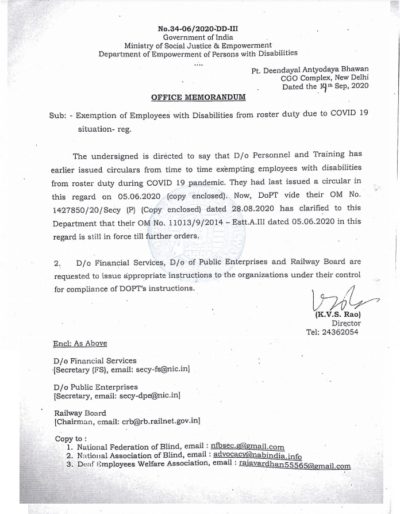 The undersigned. is directed to say that D/o Personnel and Training has earlier issued circulars from time to time exempting employees with disabilities from roster duty during COVID 19 pandemic. They had last issued a circular in this regard on 05.06.2020 (copy enclosed). Now, DoPT vide their OM No. 1427850/20/Secy (P) (Copy enclosed) dated 28.08.2020 has clarified to this Department that their OM No. 11013/9/2014 – Estt.A.III dated 05.06.2020 in this regard is still in force till further orders.