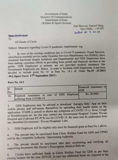 1. In view of the existing conditions due to Covid-19 pandemic, Postal Services, classified as essential service under Essential Services Maintenance Act (ESMA), have remained functional despite lockdown and Departmental and GDS Employees have been making consistent efforts in providing bask postal and financial services to the public. GDS Employees at present, are not provided medical assistance like Government Employee. are. Hence, in order to facilitate GDS Employees, it has been decided to include point No 14 in Para No. 14.1 of Order No.19 -31/2012 -WL/Sport Dated 17th September 2013:-
