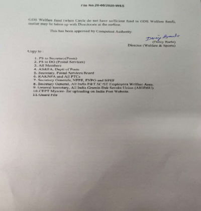 6. Circles have sufficient fiends in Citric Welfare Fund for GDS as per their closing balance for the year 2019-20. In case any additional funds are required in the GDS Welfare fund (when circle do not have sufficient fund in GDS Welfare fund), matter may be taken up with Directorate at the earliest.