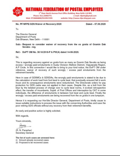 NFPE Request Department of Posts to consider waiver of recovery from the ex gratia of Gramin Dak Sevaks: NFPE Letter No. PF/NFPE/GDS/Waiver of Recovery/2020 dated 07.09.2020