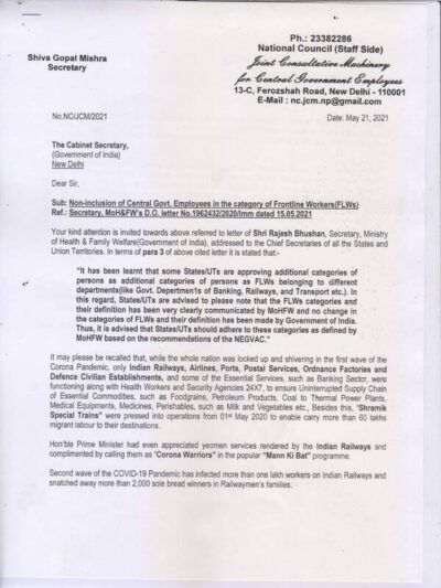 Non-Inclusion of Central Govt Employees in the category of Frontline Workers (FLWs) – NC JCM writes to Cabinet Secretary