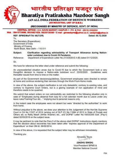 BPMS demands to withdraw Clarification regarding non-Admissibility of Transport Allowance during Nation- wide Lockdown due to Covid-19 Pandemic