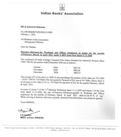Dearness Allowance for Workmen and Officer Employees in banks for the months of February, March & April 2021 @ 26.18 % of ‘pay’ under X BPS/ Joint Note dated 11.11.2020