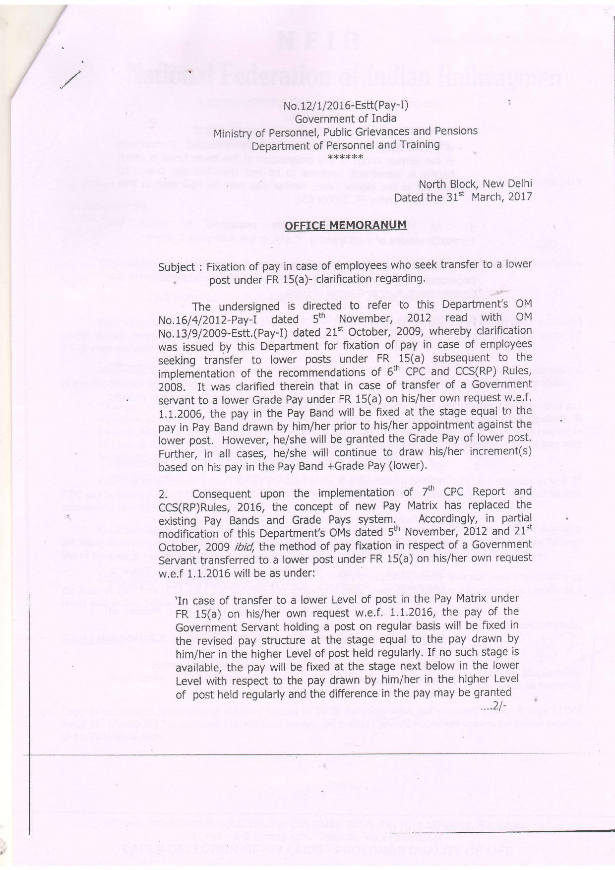 Kind attention of Railway Board is invited to DoP&T’s OM dated 31st March, 2017 (quoted under reference) on the subject pertaining to fixation of pay in the case of employees who seek transfer to a lower post under FR 15(a), copy enclosed.