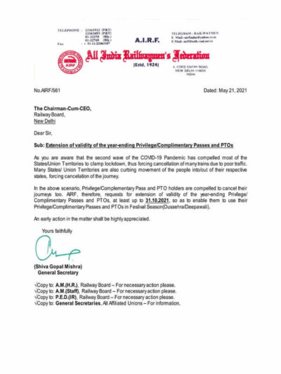 In the above scenario, Privilege/Complementary Pass and PTO holders are compelled to cancel their journeys too. AIRF, therefore, requests for extension of validity of the year-ending Privilege/ Complimentary Passes and PTOs, at least up to 31.10.2021, so as to enable them to use their Privilege/Complimentary Passes and PTOs in Festival Season(Dussehra/Deepawali).